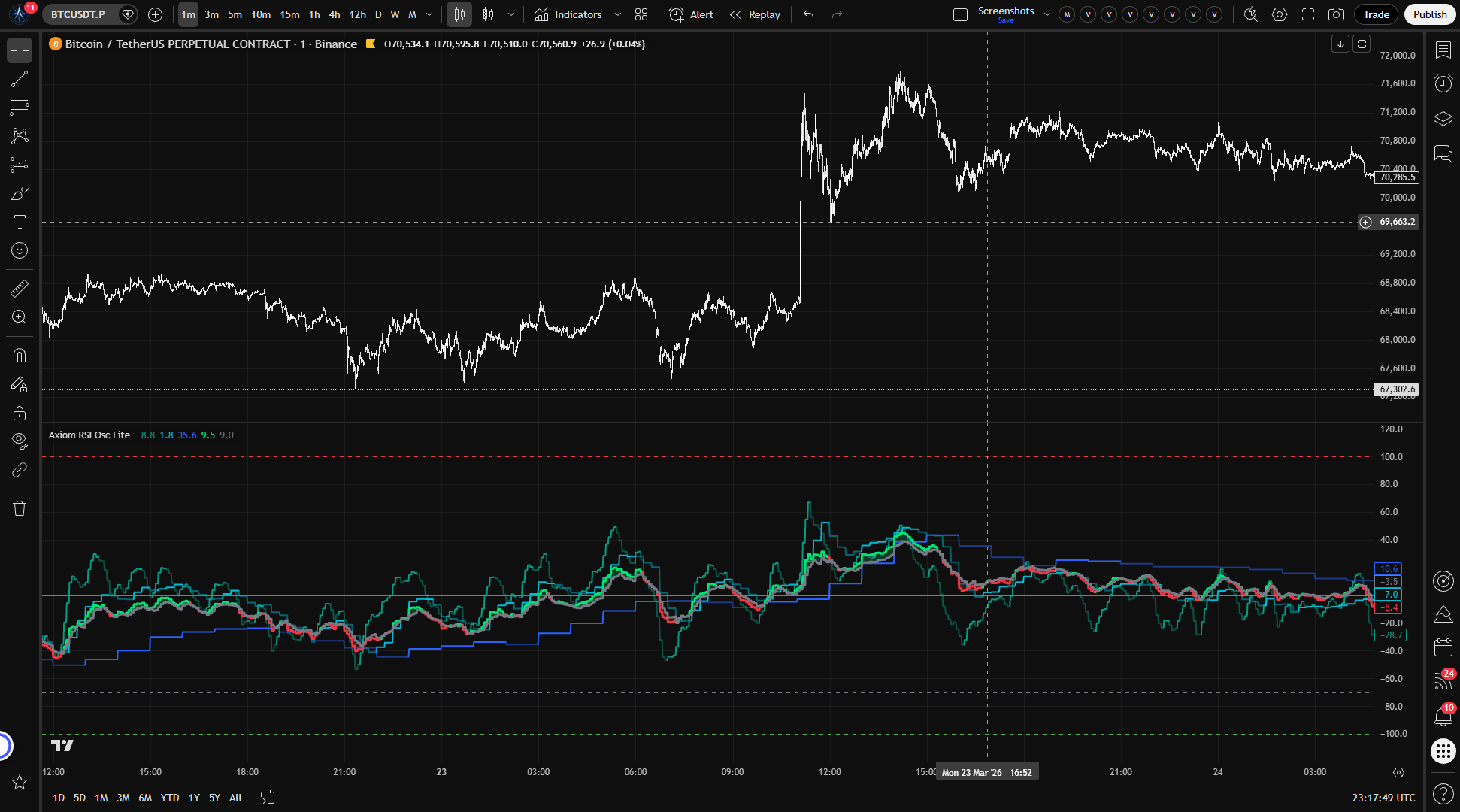 Axiom RSI Osc Lite runs up to three RSI slots, smooths each one into an RSI and signal pair, converts the output to a zero-centered bipolar scale, and blends the active slots into one readable pane. It is for traders who already use RSI and want faster timeframe comparison without pretending the blend is a signal.