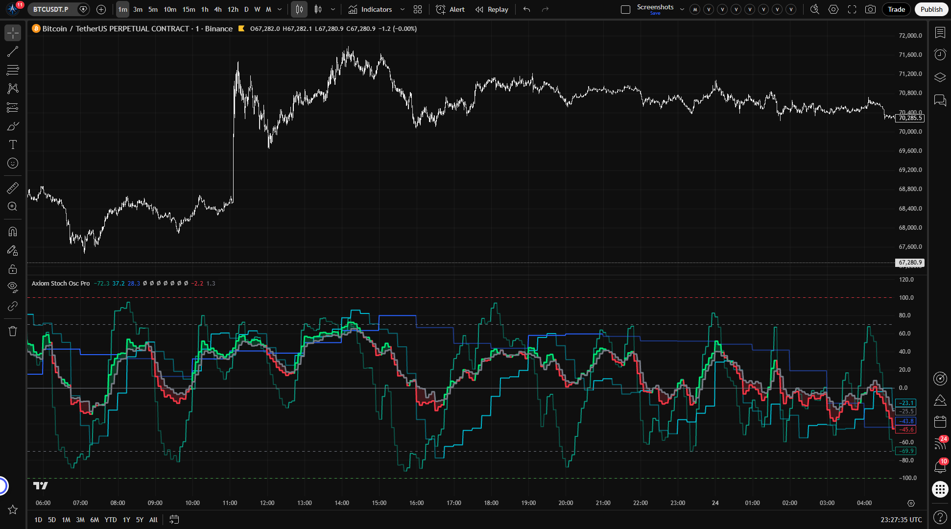 - Watch the individual slot K lines for per-timeframe momentum direction. Brighter color means K is above D (bullish regime); dimmer color means K is below D (bearish regime).